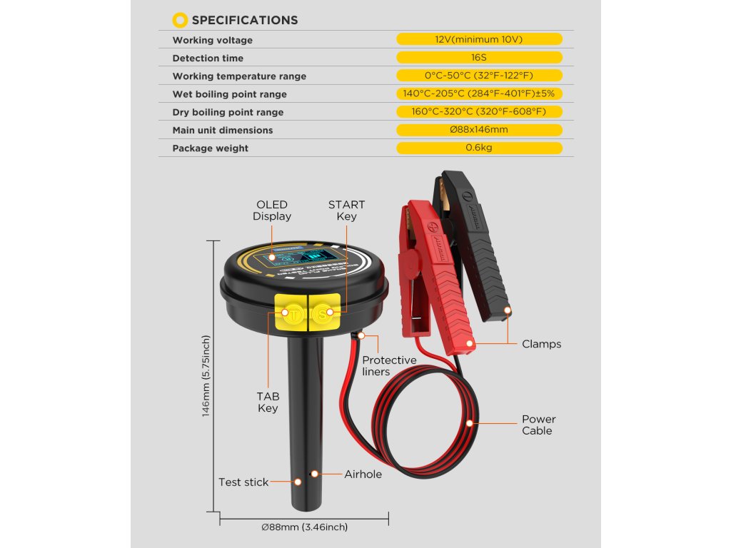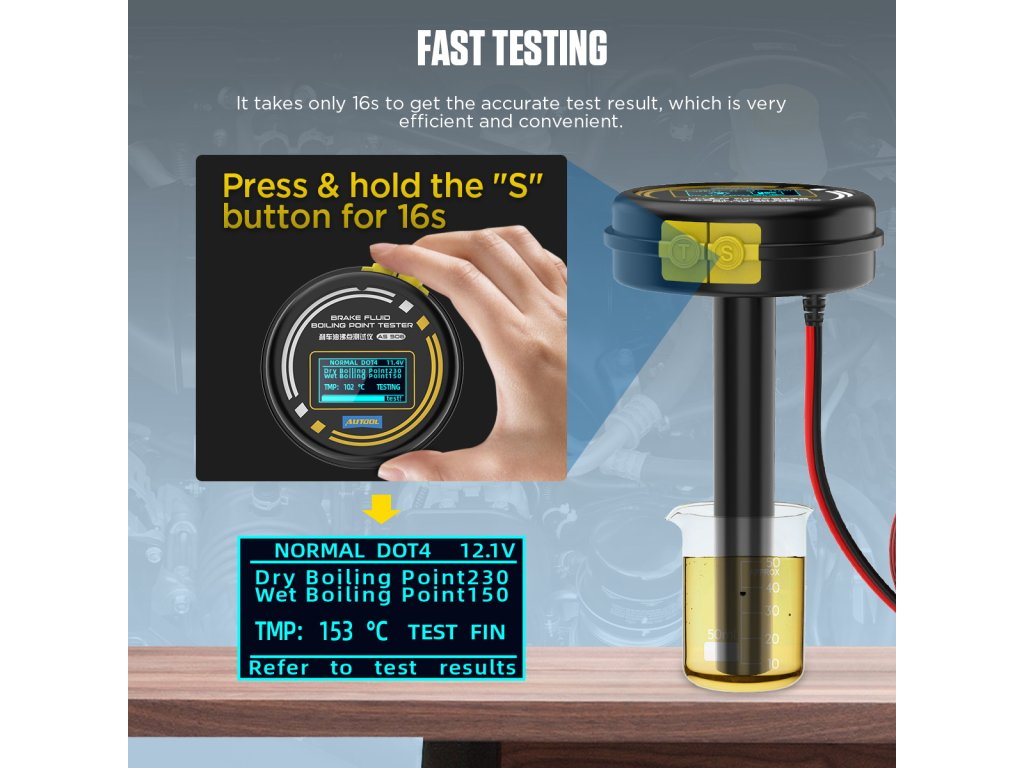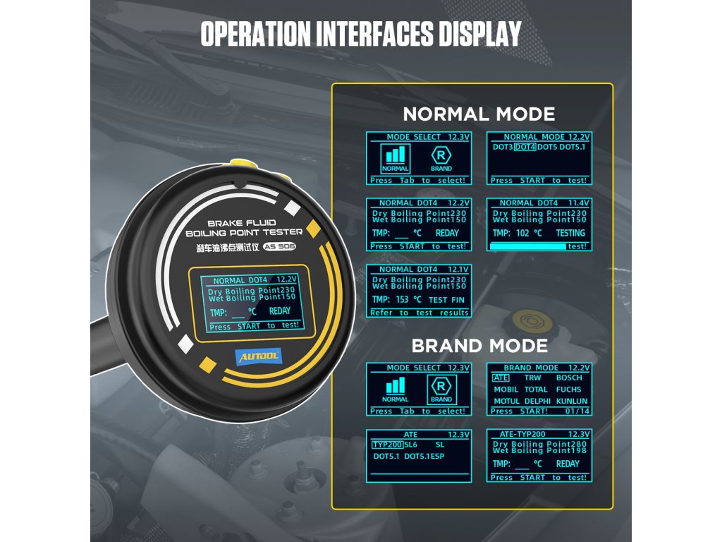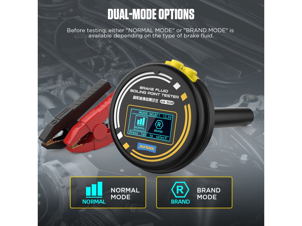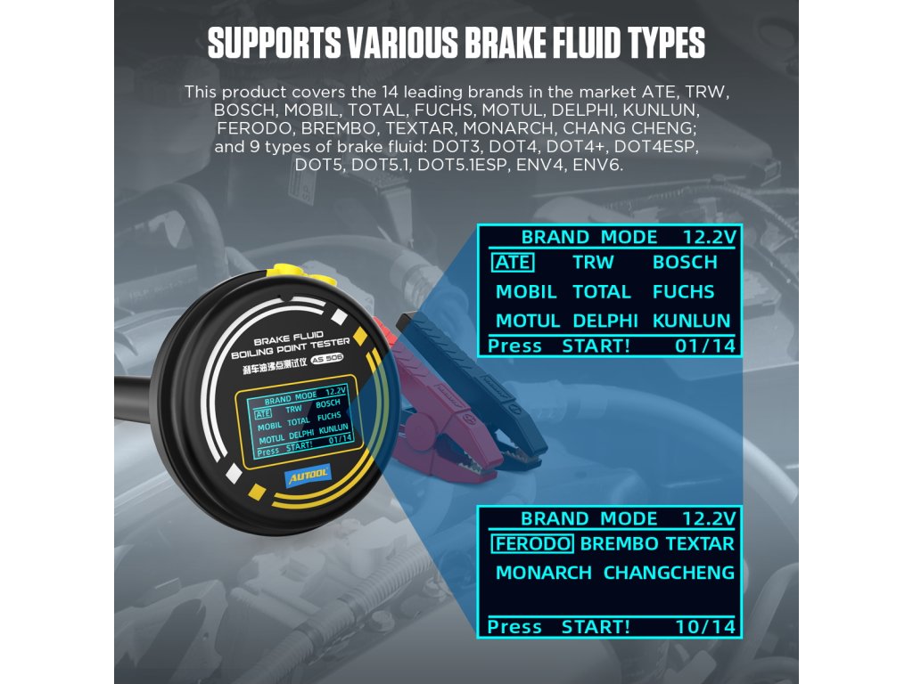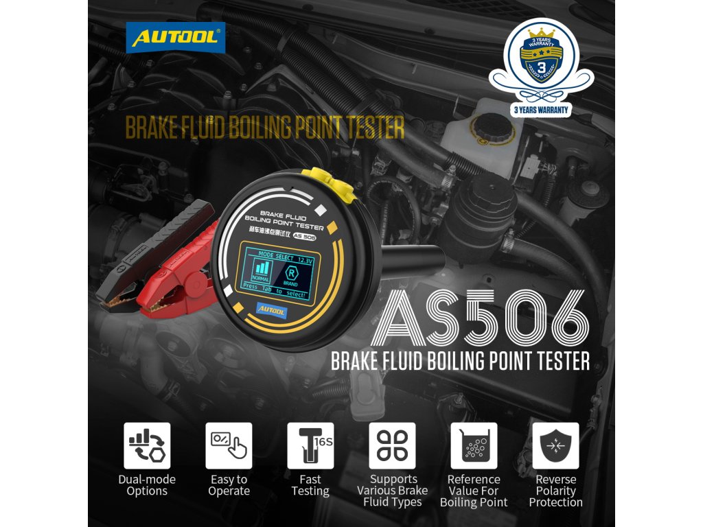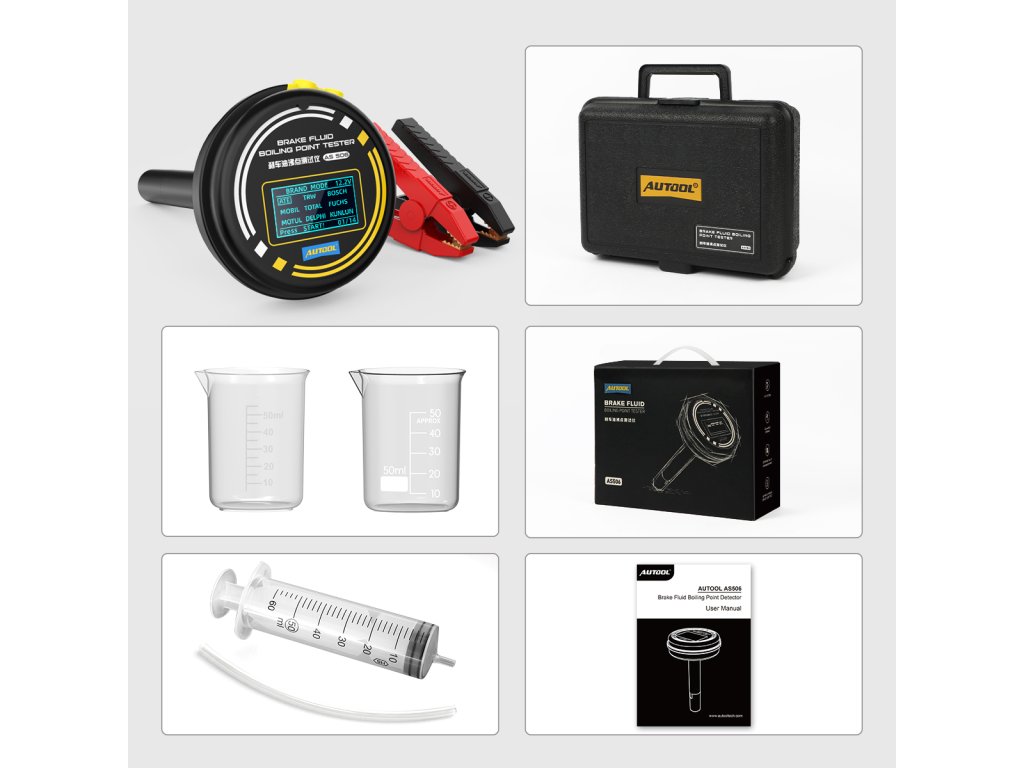AS506 Tester bodu varu brzdové kapaliny umožňuje přesné a rychlé měření bodu varu všech typů brzdových kapalin pomocí inovativní ohřevné sondy a zobrazování výsledků na LCD displeji. Vhodný pro autoservisy i individuální použití, tester výrazně zkracuje čas na kontrolu a pomáhá odhalit zvýšený obsah vody v kapalině.