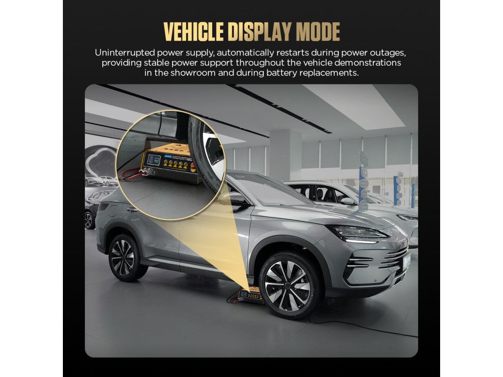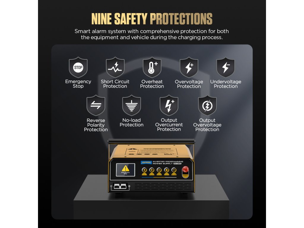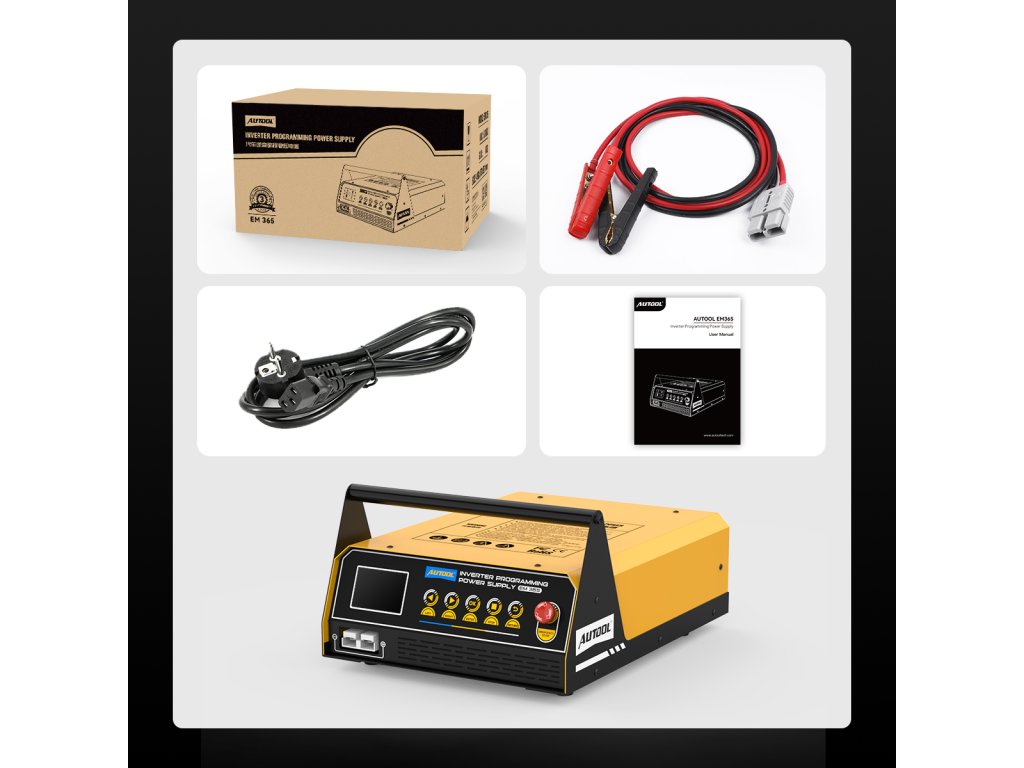 EM365 je profesionální 3v1 programovatelný napájecí zdroj a nabíječka pro autoservisy, autodiagnostiky a elektrikáře. Umožňuje spolehlivé napájení, nabíjení i obnovu olověných, AGM, GEL a EFB baterií, včetně podpory programování ECU. Poskytuje vysokou bezpečnost díky pokročilým ochranným funkcím a přesné ovládání výstupních parametrů.