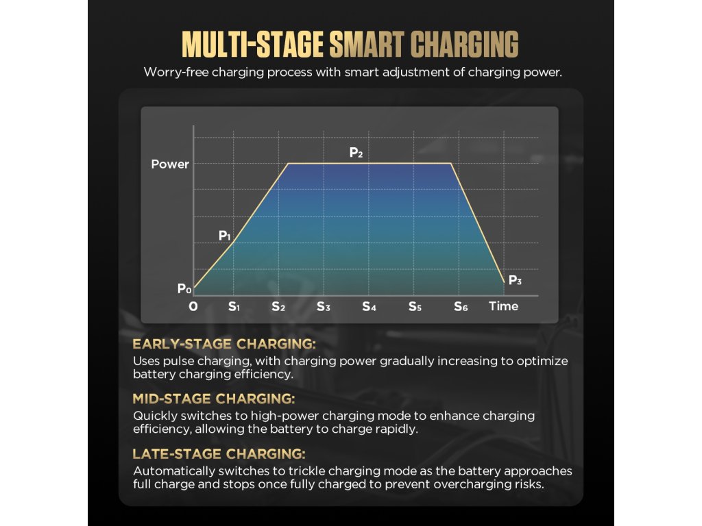 - Automatická detekce stavu a přizpůsobení nabíjecí křivky