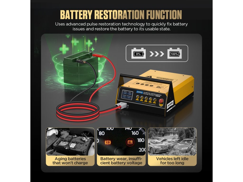 Programovatelný napájecí zdroj EM365 je pokročilý 3v1 zdroj pro nabíjení, napájení a obnovu trakčních baterií ve vozidlech. Je určen pro použití v autoservisech, diagnostických stanicích a všude tam, kde je potřeba přesné a bezpečné napájení během programování řídicích jednotek (ECU), regenerace nebo rychlonabíjení baterií.