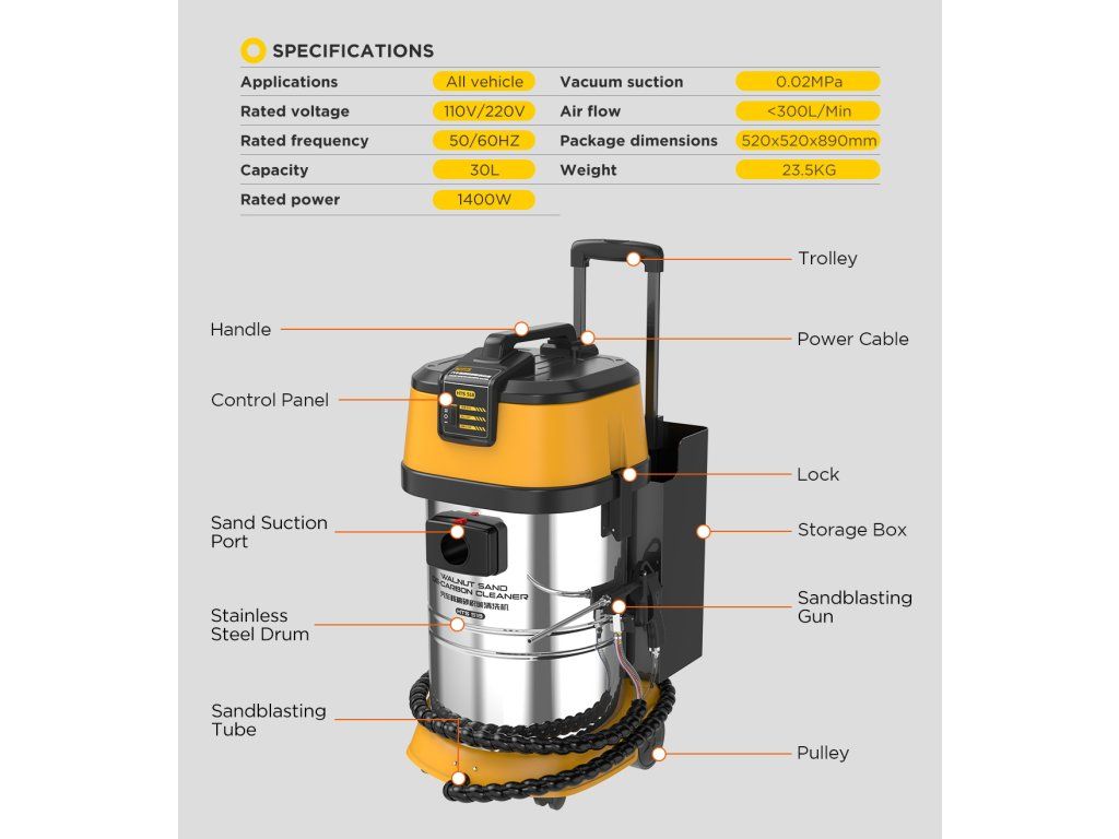 AUTOOL HTS518 Walnut Blasting Machine je pokročilé zařízení pro čištění karbonových usazenin v motoru automobilu. Je navrženo pro hloubkové odstranění karbonu z motoru. Pomáhá řešit problémy, jako jsou nestabilní volnoběh, neúplné spalování paliva a zvýšená spotřeba. Zařízení AUTOOL HTS518 je vybaveno výkonným motorem o příkonu 1400 W, který zajišťuje silný sací výkon. K čištění používá neškodné drcené skořápky vlašských ořechů a integrované filtrační síto odděluje karbonové usazeniny od abraziva, takže lze abrazivo znovu použít. S podporou externího vzduchového kompresoru zařízení poskytuje silný tryskací účinek, který zajišťuje důkladné vyčištění sacího potrubí a ventilů a pomáhá obnovit optimální výkon motoru.