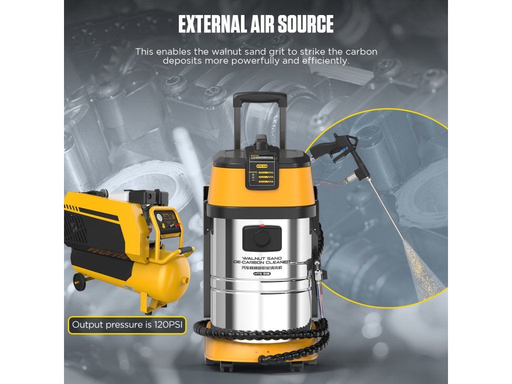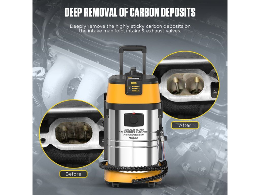 Walnut blaster pro čištění sacích ventilů je poháněn výkonným 1400W motorem a využívá externí zdroj vzduchu pro nepřetržitý výkon. Tím se zvyšuje účinek abraziva a zajišťuje důkladné odstranění karbonu z motorových kanálů.