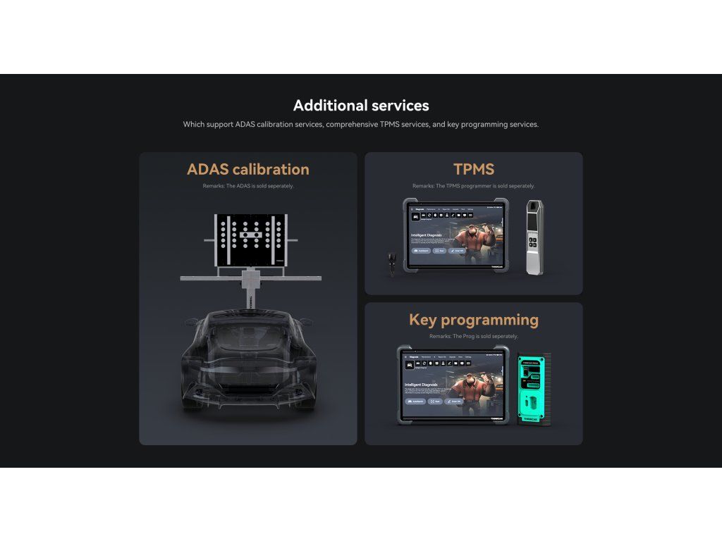 - Další služby, které podporují kalibraci systémů ADAS, komplexní služby TPMS a programování klíčů.