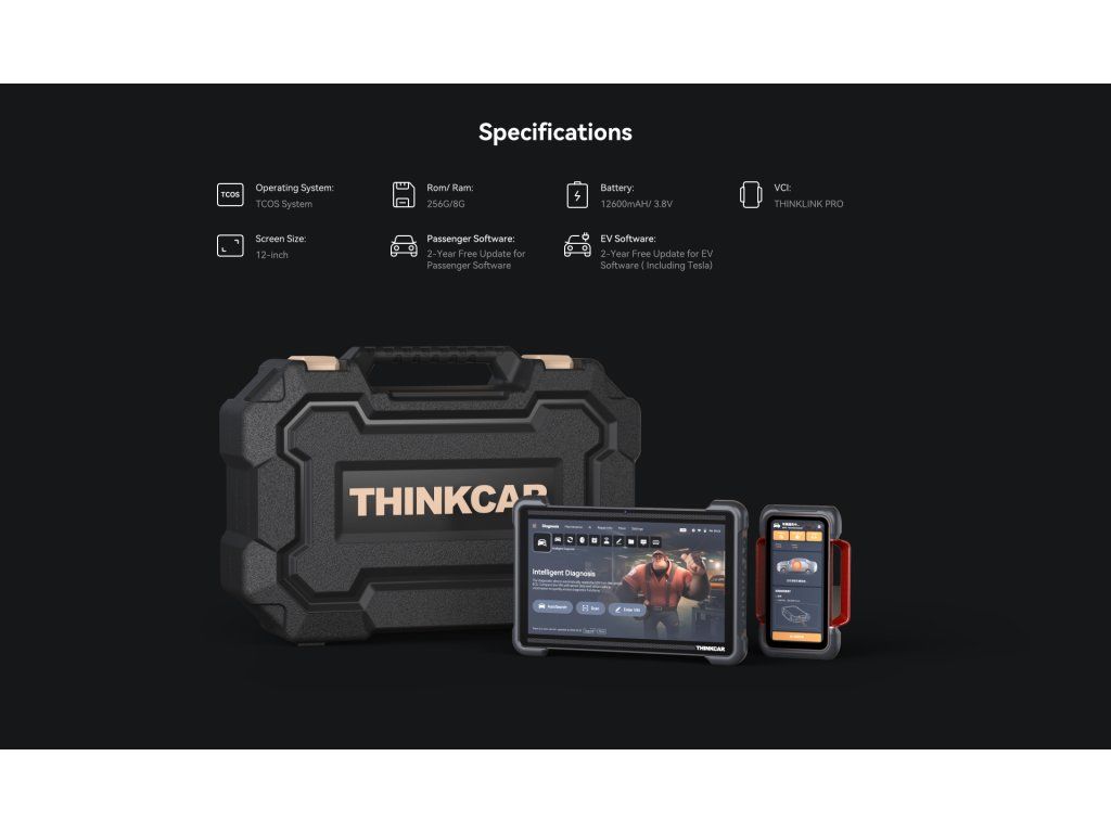 - Vybaven diagnostickým softwarem pro elektrická vozidla (EV) jako standard a volitelný balíček THINKCAR EV (konektory).